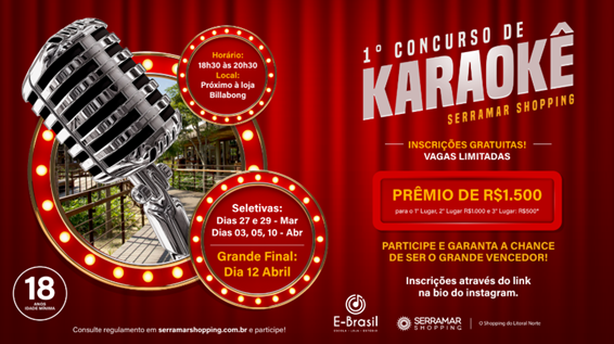 Vem aí o 1º Concurso de Karaokê, do Serramar Shopping, em Caraguatatuba! Se você gosta de cantar e não é profissional na área, já anote na agenda: serão duas seletivas, marcadas para o seguinte período: 27 e 29 de março e dias 3, 5 e 10 de abril. O evento é uma parceria com a escola de música E-Brasil e a final acontecerá em 12 de abril.