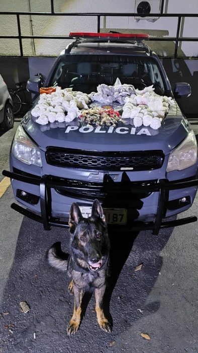 De acordo com informações da Polícia Militar, a ação começou por volta das 21h, durante um patrulhamento tático realizado pela equipe do canil. O faro do animal conduziu os agentes até um ponto suspeito, onde foram encontradas duas sacolas plásticas contendo as drogas, próximas à Rua Domingos Macedo de Custódio.