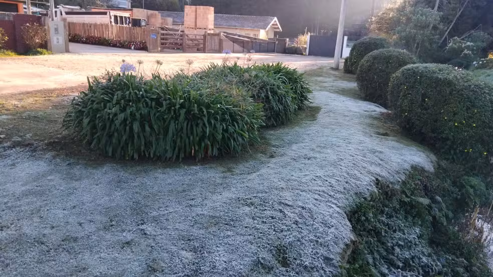 A combinação entre a baixa umidade do ar e as temperaturas negativas favoreceu a formação de geadas em superfícies como gramados, vegetação e até veículos.