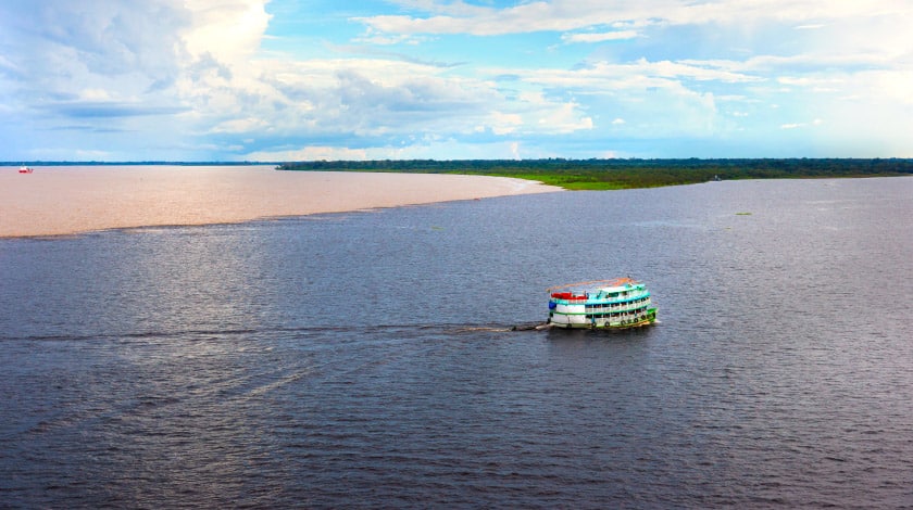 Considerado o maior patrimônio imaterial de Manaus, no Amazonas, o Encontro das Águas é fenômeno que fascina quem viaja à capital amazônica. Por causa das diferentes velocidades, temperaturas e densidades, os rios Negro e Solimões correm cerca de 6 km sem se misturar, dando origem, então, à atração.