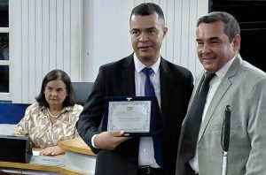 O homenageado Anderson Henrique e o autor da propositura vereador Cícero Fabiano. Sentada a prefeita de Paraibuna, Professora Helô