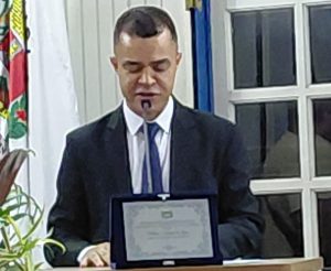 Anderson Henrique (Gerente do Sicoob Cressem) recebe o Título de Cidadão Paraibunense das mãos do vereador e presidente da Cãmara Municipal da Estância Turística de Paraibuna, Cícero Fabiano.