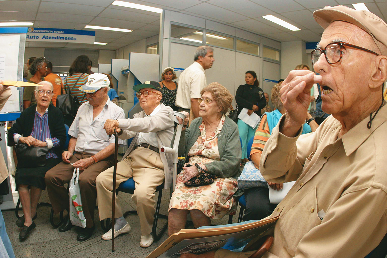 Idosos aguardando na fila para o recadastramento de aposentados e pensionistas com mais de 90 anos, no posto de atendimento do INSS do bairro de Copacabana.