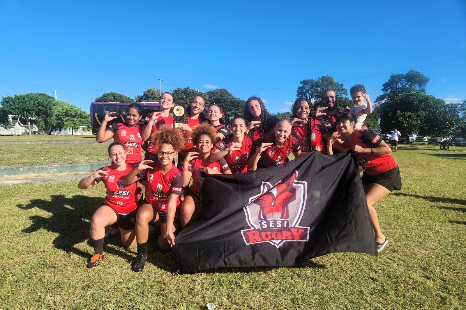 SESI Jacareí Rugby Sub-19 Feminino com o troféu de campeão do Paulista de Sevens 2026 – Foto: Ícaro Leal/Jacareí Rugby