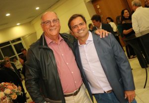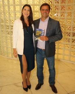 Ana Beatriz Bontorim que fez o cerimonial da noite, em homenagem ao amigo Odilson, recebe o exemplar do livro pelas mãos do autor e do governador em exercício Felicio Ramuth