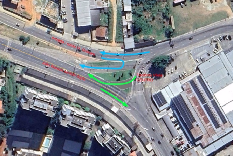 A pista inferior passará a atender exclusivamente os moradores da Vila Guarani, no trecho entre a rotatória e a Rua João Alves Viana. Já os motoristas que vêm da zona leste em direção ao anel viário utilizarão um trajeto provisório, permitindo o acesso direto à pista superior sem gerar conflito com os veículos que entram ou saem do bairro.