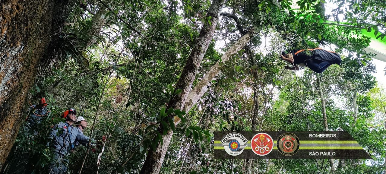 Um piloto de asa-delta precisou ser resgatado após perder o controle do equipamento e ficar suspenso em uma árvore, em uma área de mata densa em Caraguatatuba, neste sábado (26).