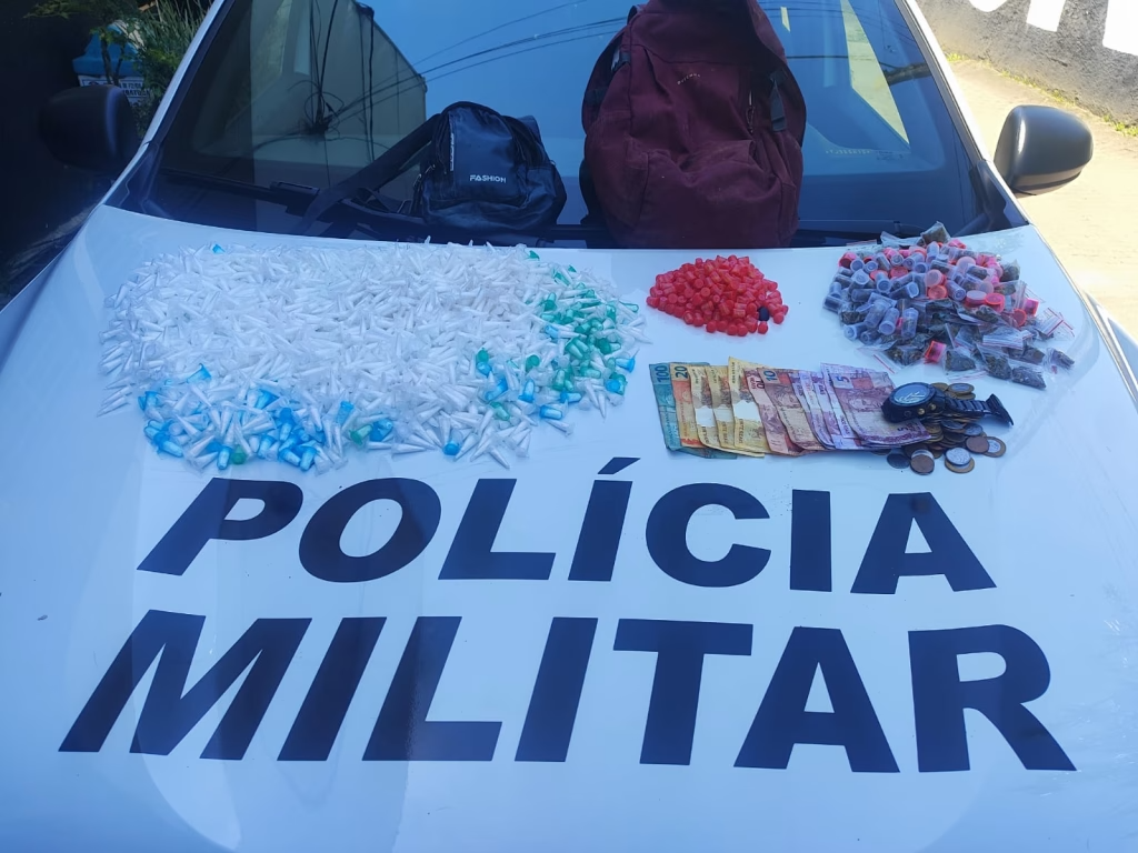 O suspeito foi rapidamente alcançado e abordado. Com ele, os policiais encontraram uma bolsa contendo drogas e dinheiro. Na verificação inicial, foram apreendidos 127 pinos de cocaína, 50 pedras de crack, 33 porções de maconha e R$ 260,30 em espécie.