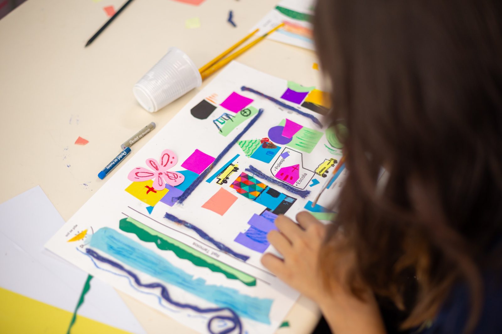 Uma das etapas mais importantes do projeto Moradas na Paisagem foi a oficina de colagem. Durante a atividade, as artistas visuais mostraram fotografias impressas colhidas no bairro. Assim, os alunos identificaram e registraram o que faz parte do dia-dia deles. Isabella Siqueira conta que A ideia era justamente despertar esse olhar mais atento para o lugar onde vivem. “Com a correria do dia a dia e as dificuldades que muitas vezes enfrentam, esse olhar atento vai se desligando”, diz.
