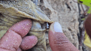 Marca metálica inserida na tartaruga em 2001 em Ubatuba